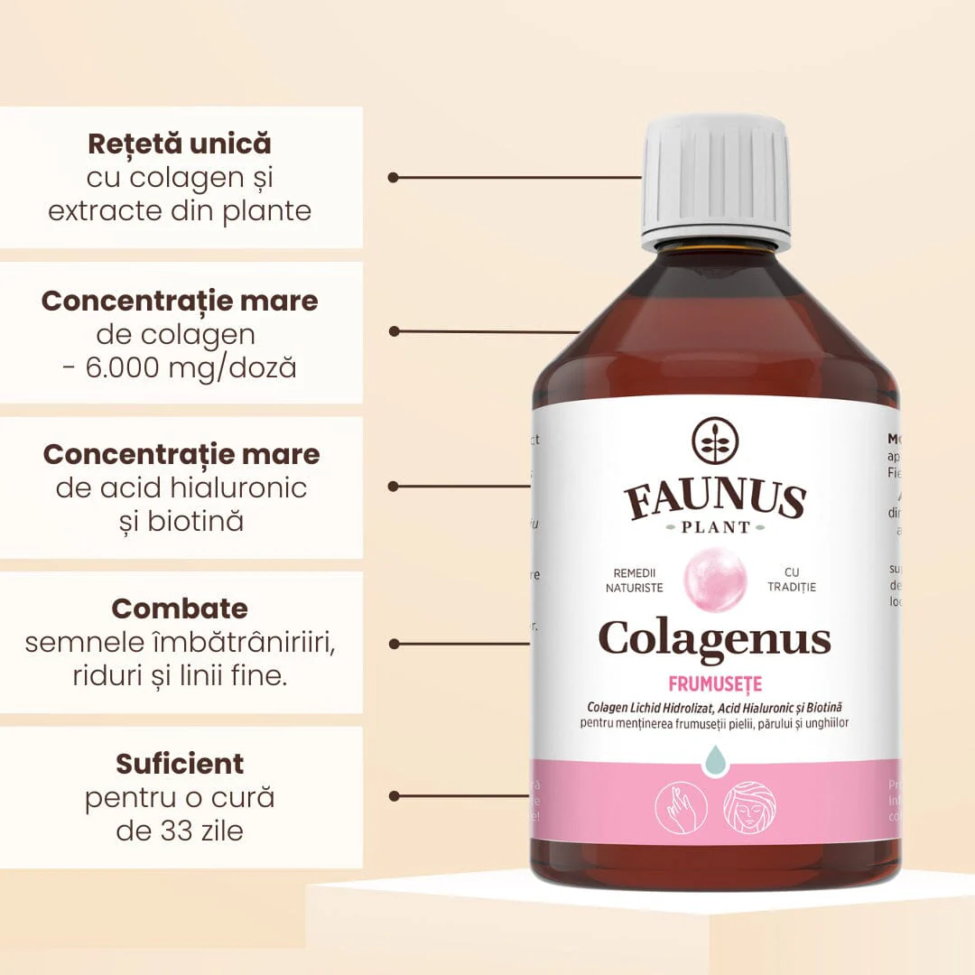 Colagenus Frumusețe - Colagen lichid hidrolizat cu acid hialuronic și biotină. Flacon 500ml. Susține sănătatea și frumusețea pielii, unghiilor și părului. Reduce ridurile și căderea părului. Întărește unghiile