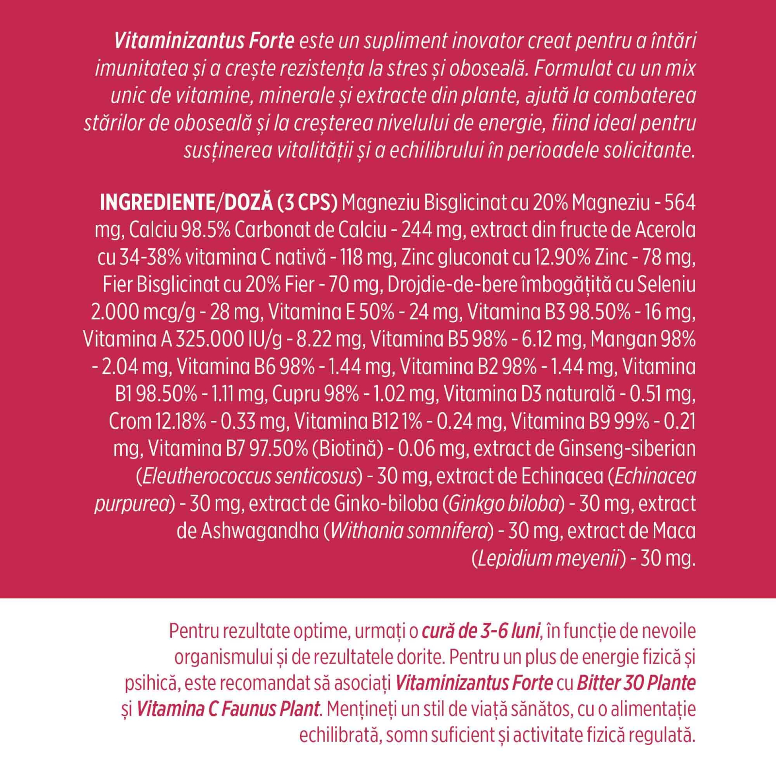 Vitaminizantus Forte capsule este un mix de vitamine și minerale de calitate superioară care se adresează celor care își doresc mai multă energie și vor să-și îmbunătățească performanța fizică și psihică. De asemenea este recomandat în perioadele de surmenaj și stres prelungit. Combinația unică din Vitaminizantus Forte contribuie la suplinirea carențelor nutriționale.